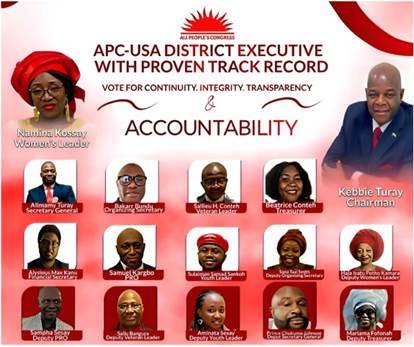 The APC USA District Executives Team continues to demonstrate strong leadership, unity, and commitment to the growth and success of the party in the diaspora. Under the current administration, the team is led by the Chairman, Mr. Kebbie Turay, who took over from Chairman Mr. Suphian Kalokoh. Since assuming office, Chairman Turay has shown outstanding dedication, working tirelessly with the executive body to ensure continuity, progress, and stability within the organization.