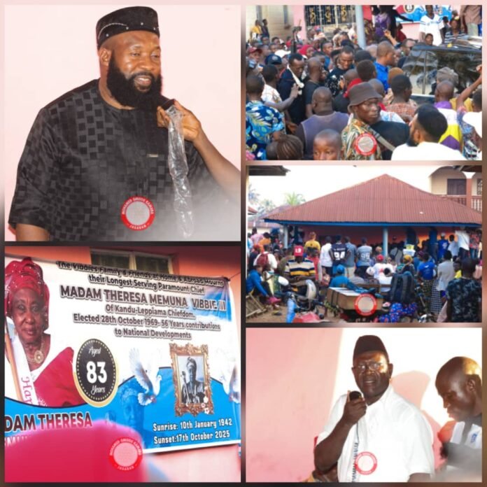 Sheikh Alhaji Mohamed “Omodu” Kamara, popularly known as Jagaban, visited Levuma Village to extend his heartfelt sympathy to the family of the late Paramount Chief Teresa Memuna Vibe, who passed away on October 17, 2025. His visit was marked by deep respect and a solemn tribute to a leader whose influence continues to be felt across the nation.