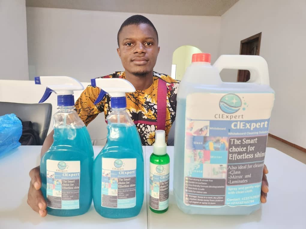 Alieu Sannoh explained that during his first year at the College of Medical Sciences, he observed that many whiteboards were stained, making it difficult for lecturers and students to effectively use them. Motivated to find a solution, he began experimenting with affordable and eco-friendly cleaning products.